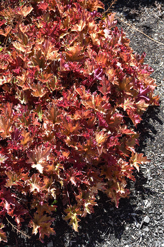 Heavily ruffled, glossy foliage emerges orange and matures to copper, with bright magenta undersides; dainty white bells ascend in summer; an outstanding foliage color addition with great versatility; keep soil moist in heat of summer